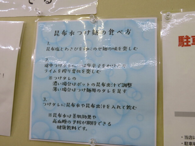 先ずは気になっていた昆布水つけ麺、昆布水に浸されている麺、その昆布水が糸を引く位ネットリしてる! コレは凄いと思ったり。 かなり濃厚に昆布出汁を注入してると思われますね。