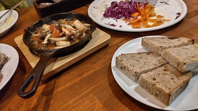 アラカルト的に大皿に盛られた料理もそれぞれ美味しく、シャインマスカットとクリームチーズの組み合わせも楽しいですし、野菜のマリネもワインが進みます