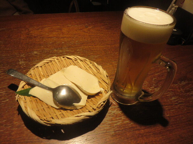 ①通しで出てきた豆腐→あっさり目でコクがある。塩を付けて食べる→塩で食うのは初めての経験→出だしで期待感が。