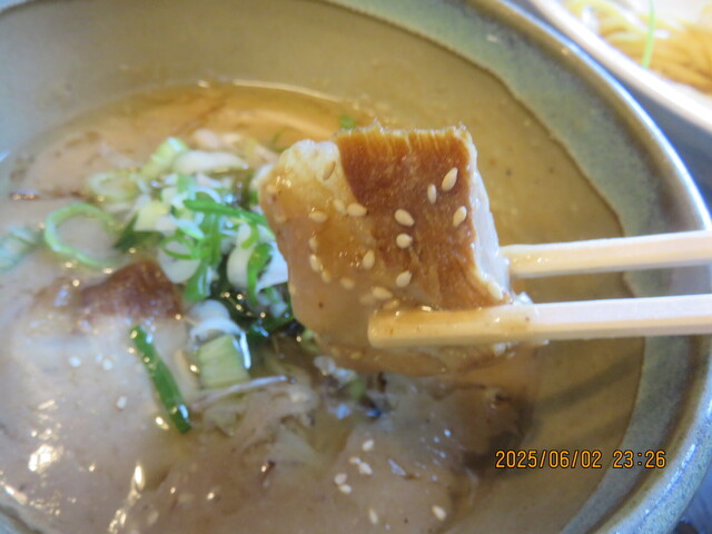 麺は「小林製麺」知らない麺かも。着丼し、麺のみを味わう、腰のあるストレート太麺で、「六里舎」と比較し他場合、やや一回り細いかも。だが、麺には、鰹かな?うっすらと味がついている。付けだれは、メンマに柚、小ネギ、挽肉、もやし、玉葱、チャーシュー2枚。自分の中で、モヤシのシャキシャキ感がないのは納得いかないが、この店はシャキシャキ感を活かしていた。見た目濃厚に見える、付けだれも、魚介と味噌のせいか、やや甘めで口の中が裕福に感じた。スープが麺に絡むと言うよりも、このスープと麺を、別世界で堪能した時、正に地元札幌で、人気がある理由が判った。美味かった~。