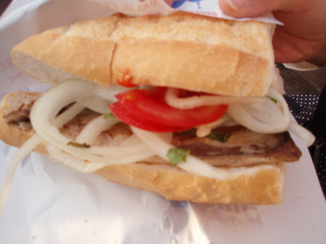 トルコのパン(バゲットのような感じ)に、焼いたサバと玉ねぎ、レタスを挟んで、