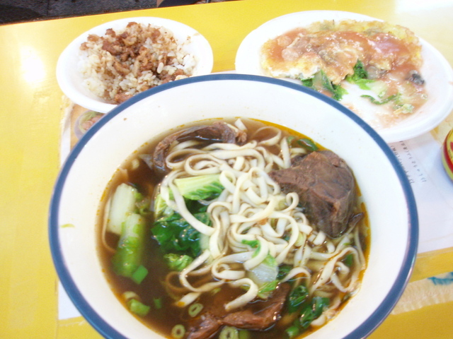 夜市の定番!牛肉麺と魯肉飯(左)と蚵仔煎(右)