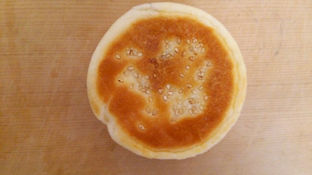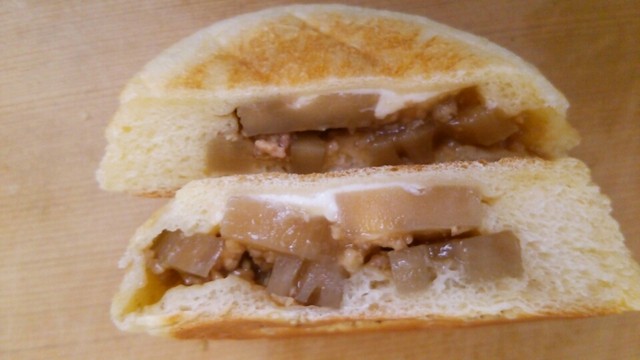 円形のソフトなパンの中に、鶏ミンチのそぼろ餡で煮込まれたレンコンがかなりしっかり入っている。仄かに生姜が香るそぼろ餡は、まさに和惣菜の世界。レンコンのシャクシャクとした歯応えも健在で、クリームチーズのまろやかさもプラスされて、もうとにかく美味い。パン生地はソフトとは言いながら、天然酵母使用らしいモチモチ感のある力強い食感だ。大変にまとまりの良い、ハイレベルな惣菜パンである。