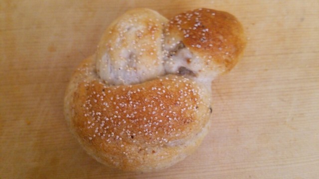 こちらのパンも天然酵母使用の生地である。この生地、②のシナモンロールに近い絶妙のモチモチ感を備え持つ。更に胡桃の食感がこれまた気持ち良く、オレンジピールの爽快感溢れる味わいも加わって、もうとんでもないことになっている。余分な甘さは抑えられており、素材の美味さが良く判る、あまりに美味過ぎる逸品である。