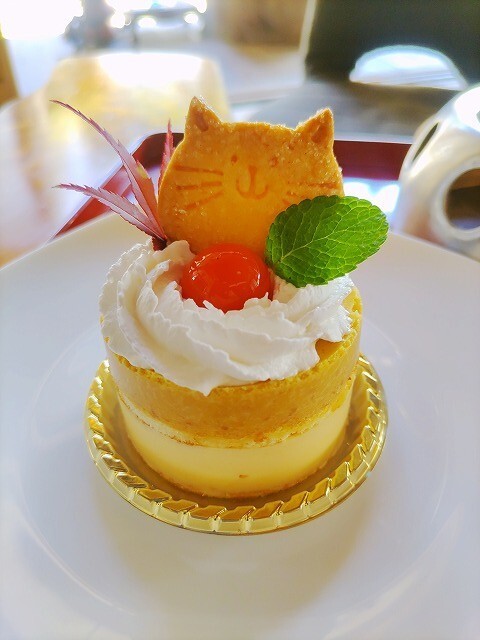 ほおずきを混ぜ込んだムースに、甘く煮たほおずきと猫のクッキーが乗ってます。