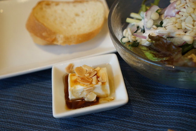 フレンチサラダに香草パルミジャーノトースト、モモ肉のマリネ。