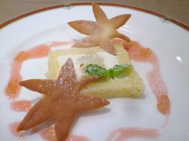 デザートはふわふわスポンジの中に栗クリームとリコッタチーズを詰めて、テリーヌ型にしたものを