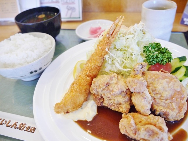 ちょっとドキドキしながらこの日のランチ、唐揚げとエビフライを頼んでみました。