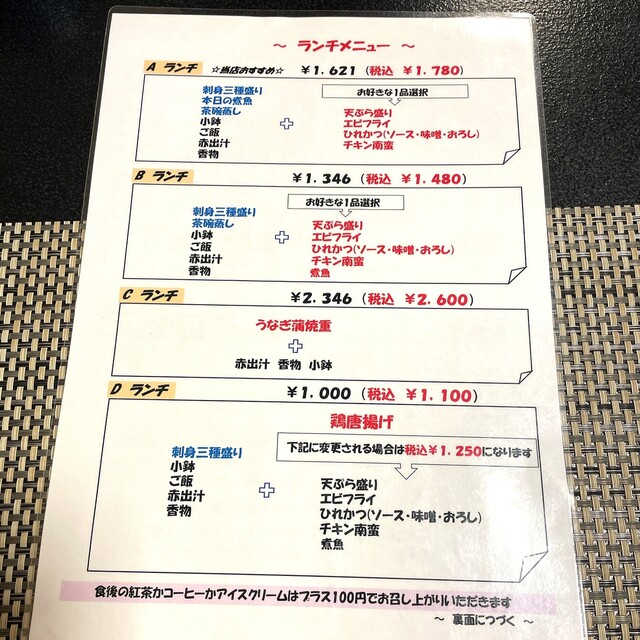 ランチは1000円、1300円、1600円、ウナギのかば焼きランチ2500 円。