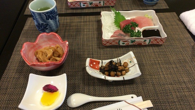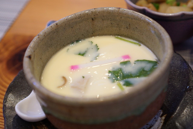 まず出てきたのがお刺身3種と煮物2種とたっぷりの茶碗蒸し。