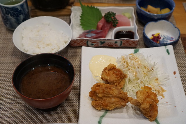 1000円だとから揚げ+お造り3種にごはんとお味噌汁と小鉢にドリンク+おデザ、