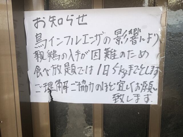 鳥インフルの影響で親鶏の入手が困難とのこと…。
