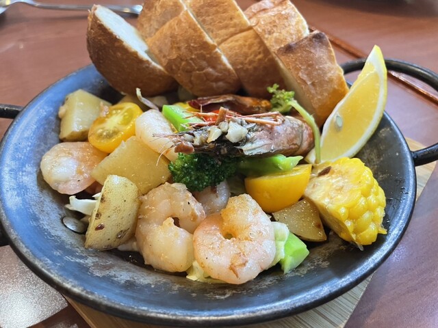 海老、黄色ミニトマト、嶽きみの様な甘いとうもろこし、ジャガイモ、そのどれもが主役で美味しいの連続♪