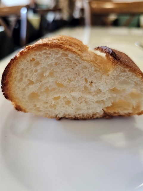 京橋おひとり様ランチ。何度かふられた「Bistrodel’image」へ懲りずに直接来店。この日は初めてOKでした!Aコースをいただきます。≪白いんげんのクリームスープ≫熱々で濃厚!粗びき胡椒が強く香っていて美味しさのポイントになっています。≪サラダ≫手作りドレッシングが優しく、食べやすいサイズの野菜。≪バケットと一緒に≫パンの味をかみしめつつ。≪メイン≫≪ライスもちゃんと一品≫カレーの香りがする上に、干しブドウが甘くて斬新!≪サツマイモポテチ≫ジャガイモのフライもバターが染みて美味し~!≪サーモンと魚介ムースのポアレ≫サーモンなんだけど、ご覧の通りのザクザク食感がいいです。ハーブもきいていて味が深いですね。≪グレープフルーツのシャーベットとチーズケーキ≫ミルク感の強いあっさりしたケーキ。≪コーヒーと一緒に≫グループやちょっと年齢層高めの方が多くて、女性一人でも安心して食べれました。