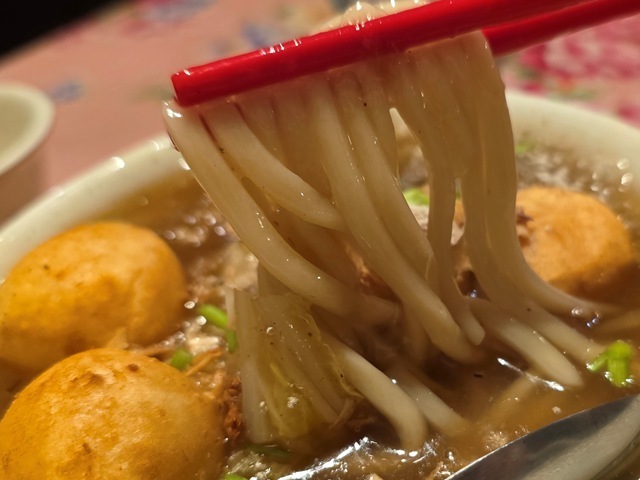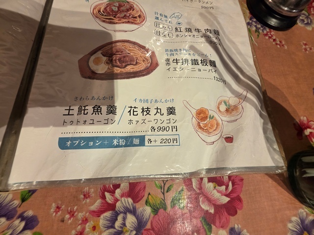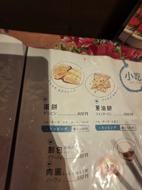 温習会後、バスで移動し「微風台南TEARSⅡ」へ。≪古民家リノベ≫≪台湾ダンボール箱≫観光感も薄れた場所に、異質な行列待ちができていました。≪台湾ぽい装飾≫京都で台湾料理?でも、お友達:飲食系職場のお勧めなので期待大!≪土間席落ち着く~≫テーブルクロスも昭和レトロなんだよね(笑)店員さん少な目で提供に時間かかるけど≪魯肉飯(ローバーブン)≫本場はル—ローハンって読まないのかー台湾の香辛料を感じるのに、甘辛さが何とも日本人好み♡≪蛋餅(ダンビン)≫玉子クレープ。わぁ、コレ!めっちゃ好き好き!モチモチ食感の生地にくるまれた玉子と甘めのソースがツボ過ぎて箸が止まらない!≪花枝丸羹(ホァズーワンゴンー)≫イカ団子の餡かけを麺でいただきます。たっぷり胡椒、絶妙なんだけど!!イカ団子の外パリ中しっとり食感といい旨味。引き続き、射抜かれた~餡スープと麺もめっちゃ絡んで(゜д゜)ウマー全体的に東南アジアの料理といより、エッジと出汁が効いた和食をいただいた印象。おなか一杯になっちゃったけど…できる事なら、もっと色々いただきたかった!