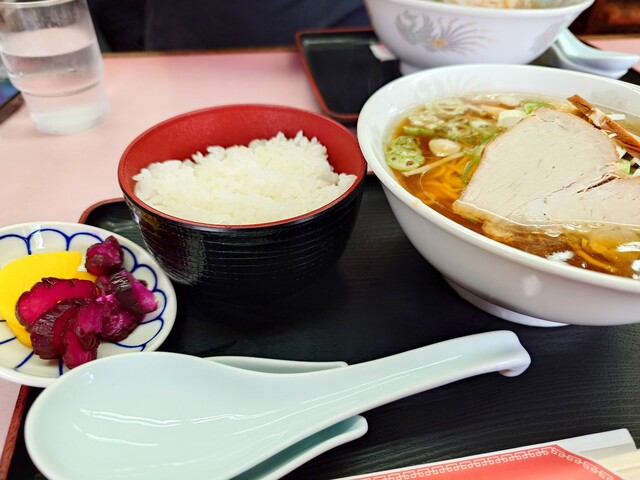 店員さんに「ラーメンライスで!」とお願いして待ちます。程なくして運ばれてきますからいただきましょう!