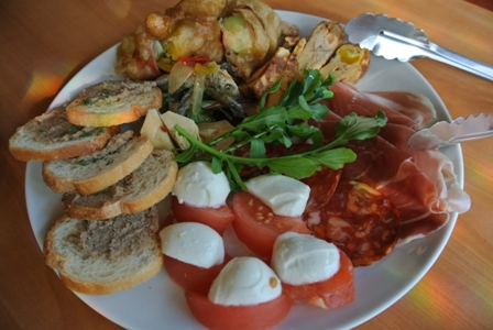 前菜 ①生ハムサラミ,②カプレーゼ,③鶏レバペーストバゲット添え,④八幡浜産小魚の素揚げビネガーマリネ,⑤いろいろ野菜のイタリア風オムレツ(冷製),⑥大洲産長ナスの生ハム巻きフリット