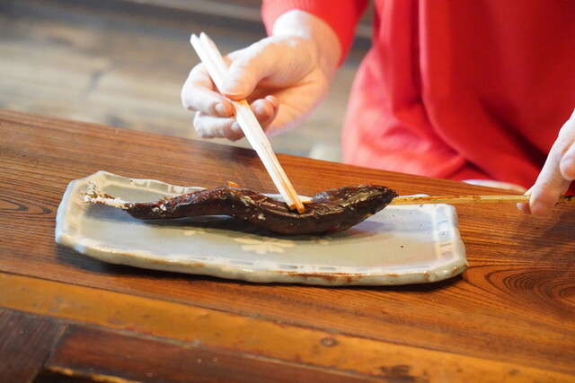 続けて「アマゴ塩焼き」・・・囲炉裏端で数時間かけて焼いたもの。「頭から食べられます」・・・確かに、爽やかな塩味。