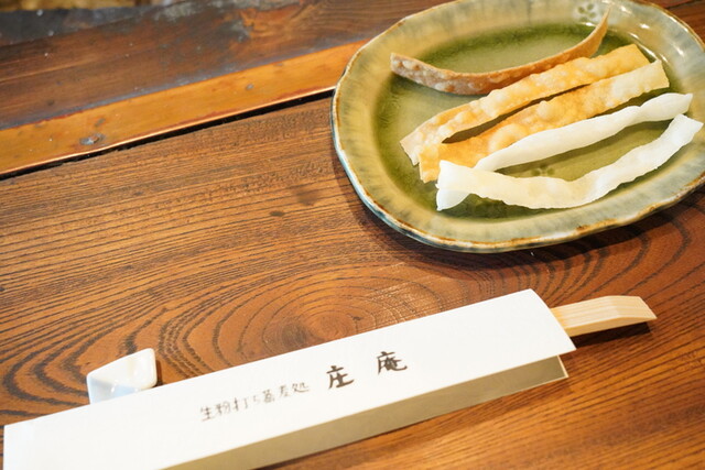 まずは、「蕎麦せんべい」が「蕎麦茶」と一緒に出された。ポリポリと食べて、香ばしい。