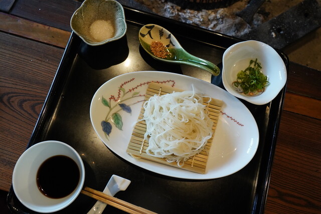 案内されて、囲炉裏のある部屋で着席。説明を受けながら蕎麦のコースが始まった。