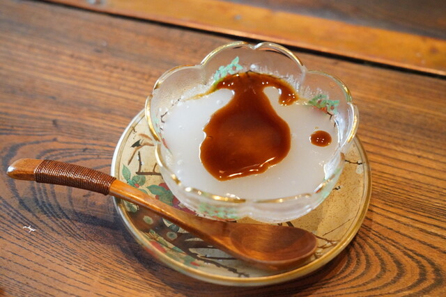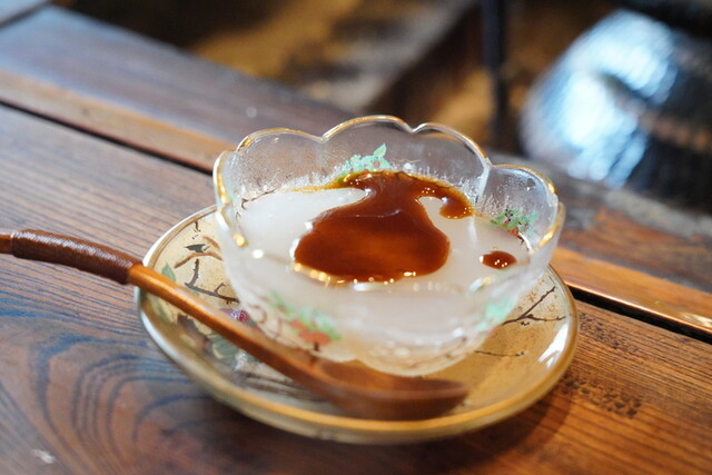 最後はデザート、白玉に餡を乗せて。どちらかと言うと辛めの味が続いたので最後の甘さが嬉しい。