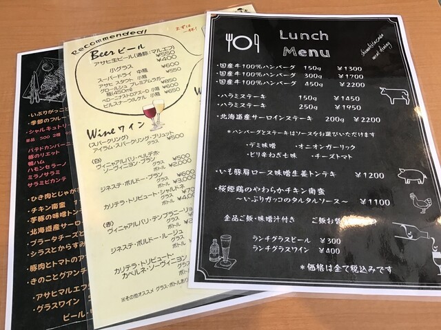 ランチメニューはハンバーグ、ハラミやサーロインのステーキ等々。