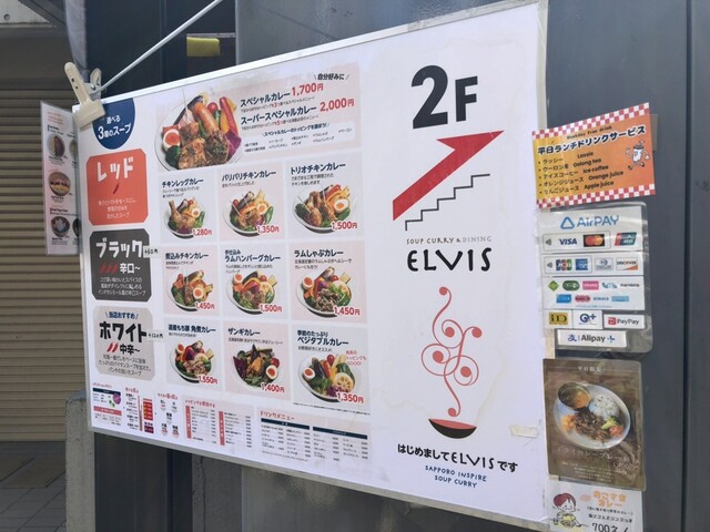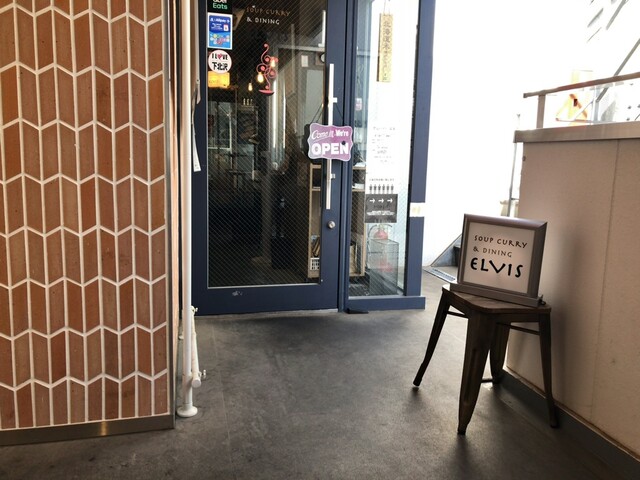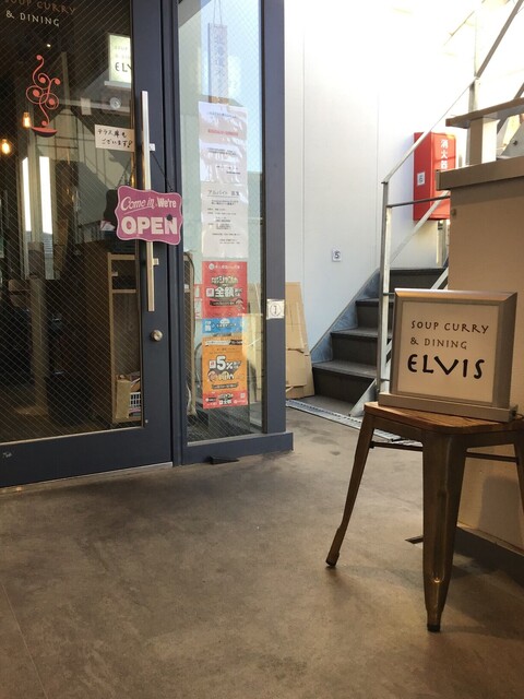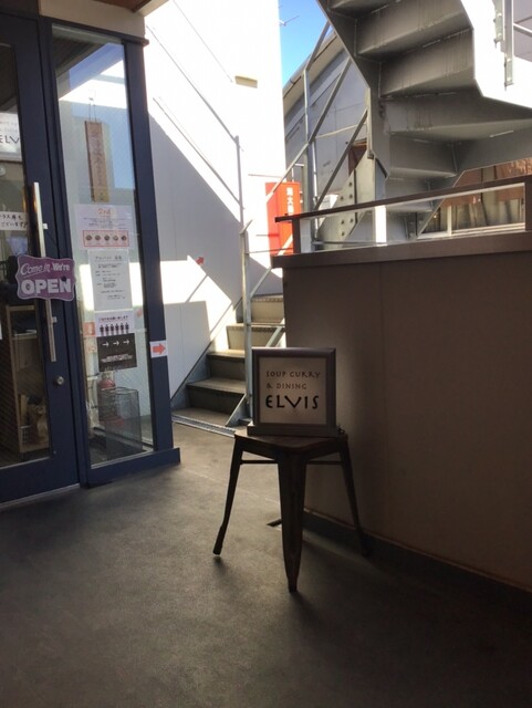 いきなり地下1階に下りる階段、その先のエレベーターで2階に行けばスープカレーの「エルビス」があります。