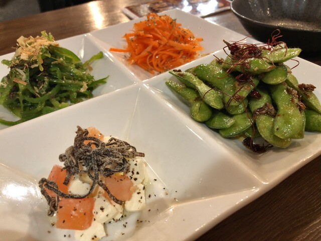 オツマミ系の「キャロットラペ」「無限ピーマン」「塩昆布クリームチーズ」