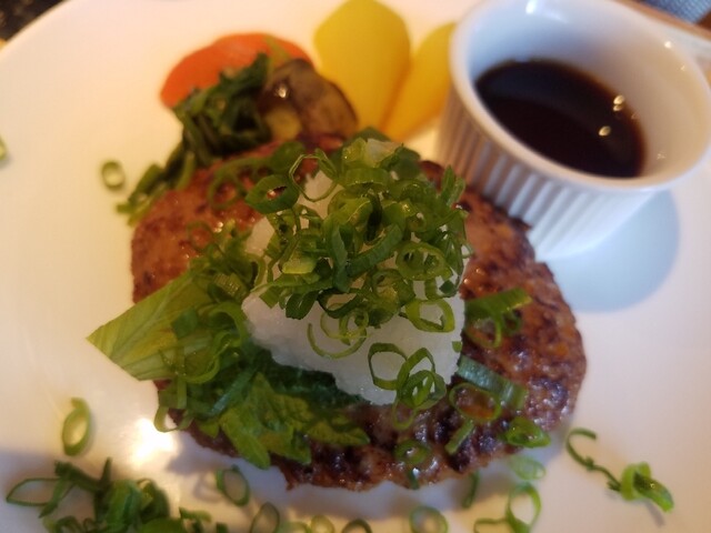 まず、ハンバーグは太くて大きくて、ふわふわな感じです。フォークで持ち上げたら崩れそうな感じです。そのままなにもつけずに食べてもいいようなハンバーグです。