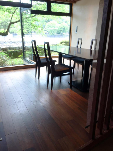 シックで落ち着いた内装と窓の外一面に広がる宇治川の眺めが素晴らしいですね。