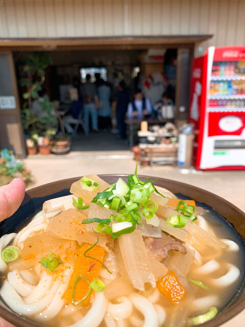 さて、タイトルのダシのかけ方・・・ですが、完全セルフスタイルで、うどんを丼ごと受け取ると、横に温める場所とダシの入った寸胴があるのですが、このダシ・・・季節ごとの「しっぽく」なんです。「しっぽく」とは、香川の郷土料理で普通は冬場に良く食べられるうどんやソバの食べ方で大根をメインに鶏肉、人参、サトイモとかを煮込んだダシなのですが、この店では年がら年中食べられるのです。