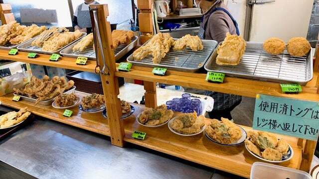 注文は「ひやかけ」のサイズ大と、「ちくわ天」「いわしフライ」「いなり寿司」などを選びました。