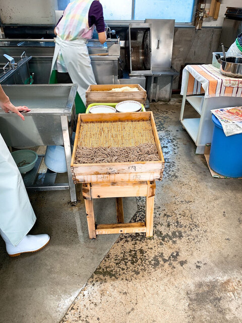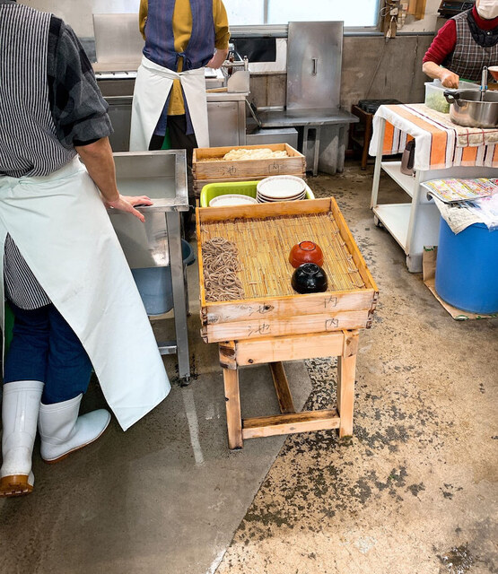 麺茹で、出汁、盛付け、薬味(ネギ)=店側