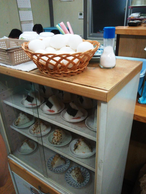 そして、土日限定だったかも知れませんが、ラーメンを注文すれば自動的にセットとして棚の中にある「イナリ」「オニギリ」「茹で卵」のいずれか一個がセットで付けれます。これが結構お得感がありますね。