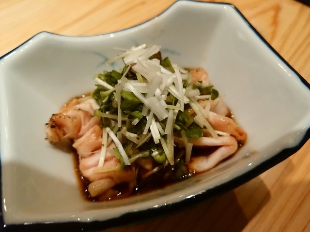コリコリ♪表面を芳ばしく炙り葱、カイワレ、ポン酢でさっぱりと。小鉢の完成度も高いな。