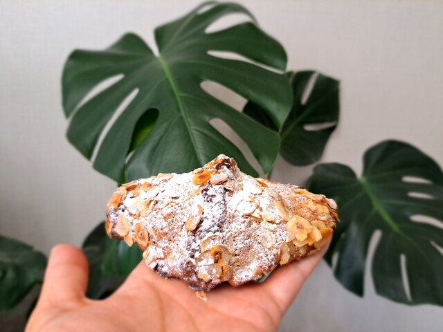 クロワッサン生地にヘーゼルナッツのプラリネ。ヘーゼルナッツクリームをたっぷりと。ヘーゼルナッツのコクがしっかり感じられるお菓子パン。唸る仕上げではないが、上質な味わい。