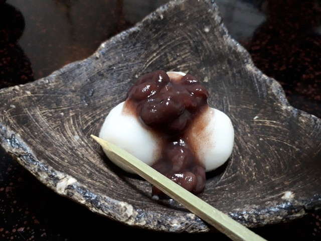 宿に到着すると出してくれるお茶とお菓子。白玉小豆に鹿児島深蒸し茶。白玉小豆がもちもちで美味しいの~(*σ´ェ`)σ