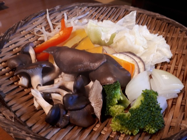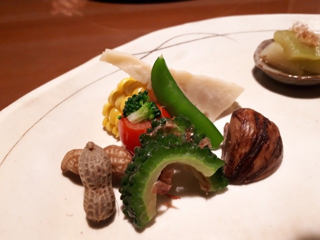 アスパラガス、カボチャ、ゴーヤ、おくら、緑竹。「天ぷらも職人が作るとこう仕上がる」という感じ。天ぷらの衣はサクサク、しっかりうま味を引き出している。他の宿とは雲泥の差。