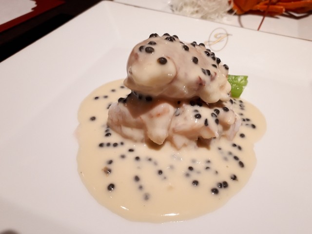 本日の一番はこちらです。驚くほど大きく厚みのある黒鮑。これにシンプルに神スープとクリームのソース。塩味はキャビアのみ。そしてパクリ…あっ、むっちゃ美味しい(///∇///)鮑としては過去最高に美味しいかも。堪らん✨✨