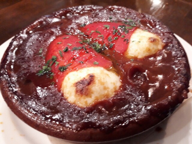 ピーマンに鱈を詰めチーズを掛けて焼いたもの。熱々のうちに…パクリ。あっ、美味しい(///∇///)玉ねぎ、乾燥ピーマン、トマトで出来たサルサビスカイーナのソースが絶品✨✨またこのうまうまソースにつけて食べるバゲットが旨すぎます。