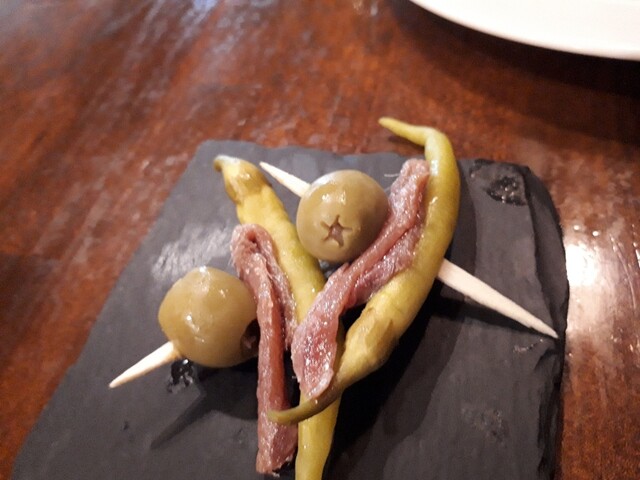 アンチョビ・オリーブ・青唐辛子のピンチョス。いつもより、塩分が押さえ気味で良かった。