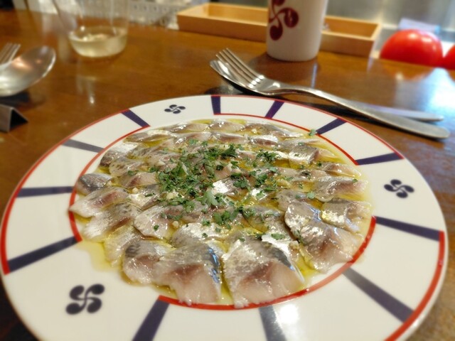 これは外せない一品。事前に頼んで置きました。綺麗に並んだ真鰯の酢漬け✨✨いかにも美味しそう、食欲が湧いてきます。そしてパクリ。あっ、いい酸味(///∇///)3日間漬けた酢漬けは酸味が絶妙。また真鰯の脂のりが良いな。添えで出てくるバゲットにオリーブオイルをつけると、とても美味しいですよ。