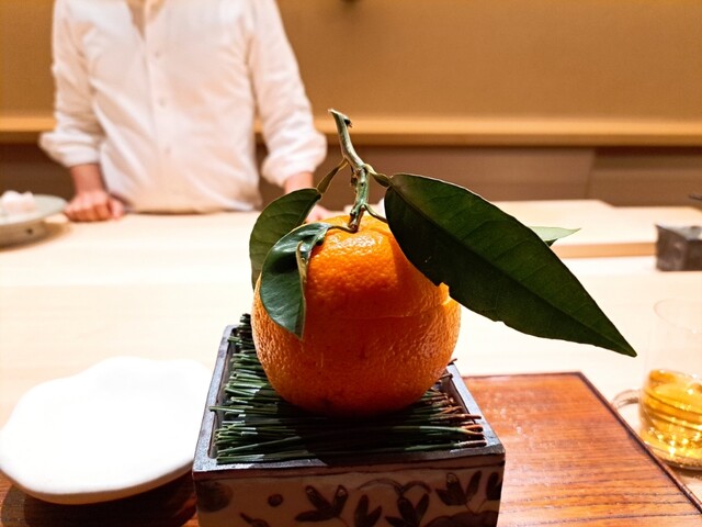 橙が美しく、愛でたいなぁ。仕上げに橙を搾って。うわっ、素晴らしい✨✨鼻に抜ける柑橘の香りが堪らない。あんぽ柿、花山葵はほんのりアクセント。個性を出して来るなぁ。