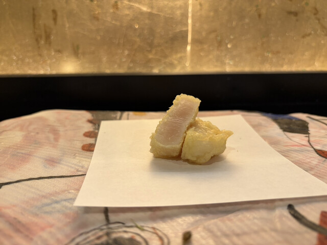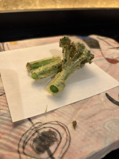 今回は12,000円の天ぷらコースを注文。コースの序盤から旬の山菜の天ぷらが提供され、香りの良さとほのかな苦味が心地よく、早くも期待が高まります。車海老は身が大きくぷりっとした食感で甘みが強く、軽やかな衣との相性も抜群。さつまいもの天ぷらも素材本来の甘さが際立ち、揚げの技術の高さを改めて実感しました。天ぷらに合わせていただいたシャンパンとのマリアージュも素晴らしく、油のキレを良くしながら料理の美味しさを一層引き立ててくれます。