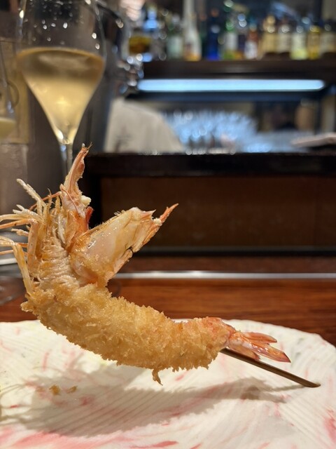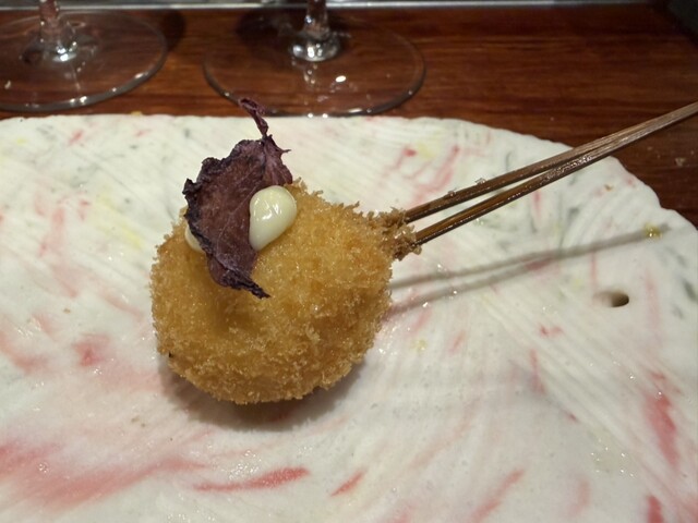 乗せられたうずらの半熟卵に、鮑の柔らかい串揚げ、シャトーブリアンの串揚げ、犬鳴きポークのトリュフソース乗せなどなど、今回はサワラの燻製の串揚げが1番かな✨しっかり燻製され、後から香りが口の中に残るほど余韻が楽しめます。ワインにもシャンパンにも合わせれます!もちろんハイボールにもあれは、おかわりしたいくらい美味しかったです✨