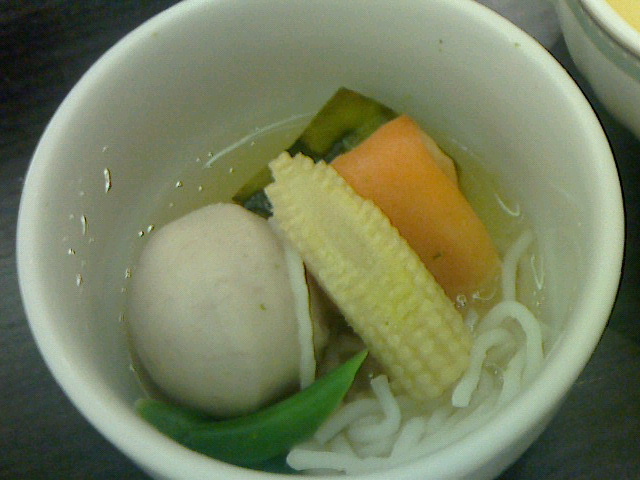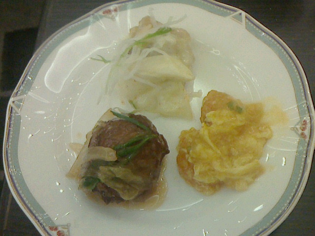 メニューは、ビュッフェ台の一番奥から、中華風玉子スープ、御飯、ナポリタン…の炭水化物に始まり、四川風麻婆豆腐、豚肉の柳川風、ブリ大根、スズキと筍・椎茸・銀杏のXO醤風、ビーフステーキ、鶏天タルタルソース添え、海老・茄子・シシトウの天麩羅…の主餐が続いた後に日本蕎麦ときて、ナメコと大根おろしの和え物、キムチ風漬け物、蒟蒻と山クラゲの和え物、何かよく分からないけど美味かった冷製スープ…の小鉢系がきて、最後に、茹で鶏の短冊切り、ベビーリーフ、スライスキュウリ、海藻類、千切人参、乱切トマト、煮豆類、クルトン…のサラダコーナーです。