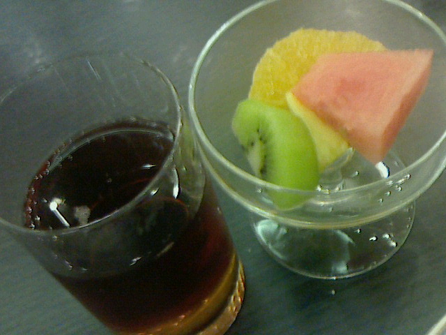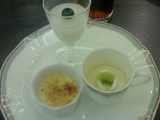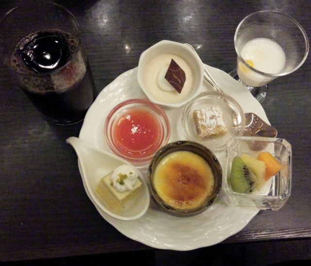 ・フルーツ&デザート5種(ケーキはシンプルだけど美味いし油臭くない、フルーツカクテルの質はまあまあうまい、キャラメルムースもクレームブリュレも美味いし、ヨーグルトの酸味の利いたゼリーカクテルも美味かった)