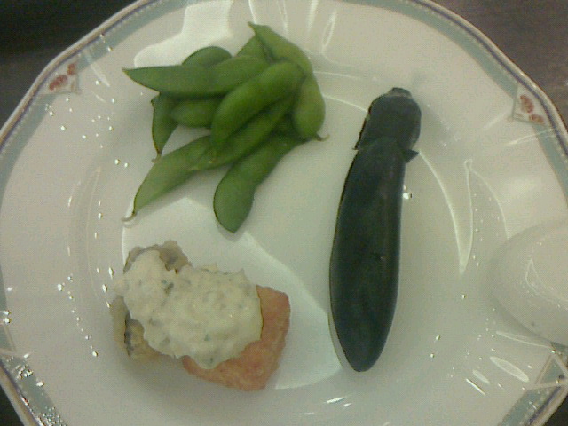 三種盛り/サーモンと夏野菜のフライのタルタルソースとレモン添え&長茄子漬け&だだちゃ豆/平成25年8月