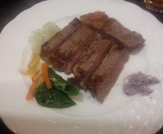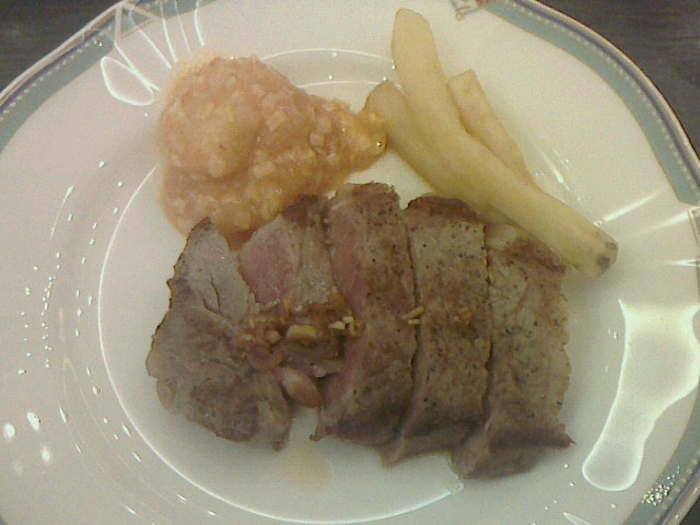 ・サーロインステーキのフライドポテト添え(みんなが一番群がるのであとでゆっくりいただいたが、美味しいステーキでした)
