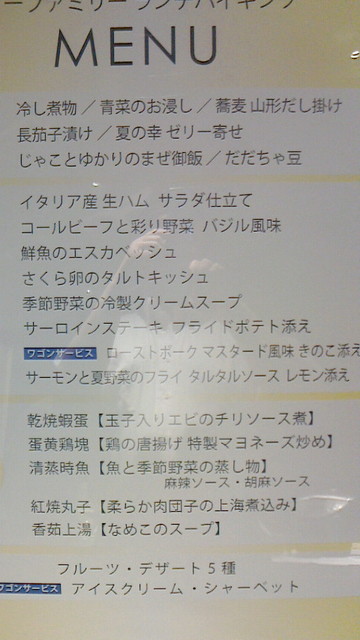 こちらはホテルメトロポリタン山形のラウンジレストランです。マイレビのまろんママさんも行かれてまずまずの評価もいただけたようですね。山形のホテルレストランとしても都会のマダムに認めていただけたというのは地方ホテルレベルの底上げとして喜ばしい限りです。こちらでは常日頃からウィークデイランチバイキングをやっていますが、8月10日から18日までのお盆休み期間中、サマーファミリーランチバイキングをやっています。ウィークデイランチバイキングでは1500円ですが、サマーファミリーランチバイキングでは2000円です。でも、ここのランチバイキングを何度か利用している兄嫁さん情報によれば、料理の品数も増えてるしウィークデイランチバイキングより間違いなく良くなっているとの事です。